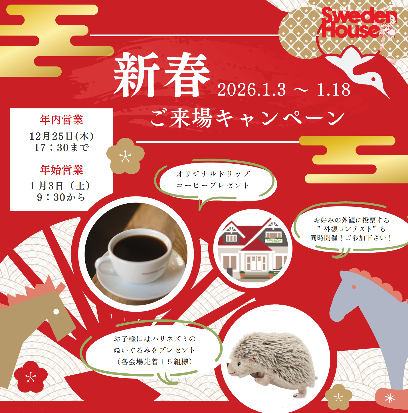 1月3日(土)~1月18日(日)までの期間中、スウェーデンハウスでは モデルハウスご来場キャンペーンを開催します! ご来場いただいたお客様へ、素敵なプレゼントをご用意しております。 ①オリジナルドリップコーヒー ②お子様には可愛いハリネズミのぬいぐるみ(先着15組様) ③スウェーデンハウスオリジナルカレンダー ④スウェーデンハウスの魅力が詰まったカタログ集