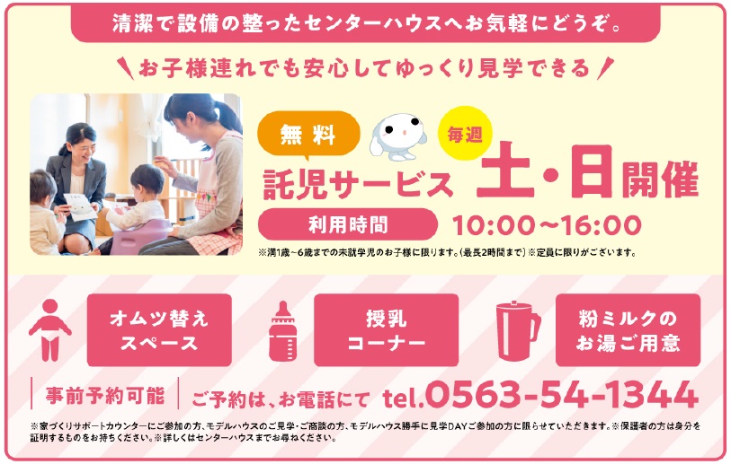 家づくりサポートカウンターにご参加の方、モデルハウスのご見学・ご商談の方、勝手に見学DAYご参加のお客様を対象に、無料の託児サービスを実施しております。